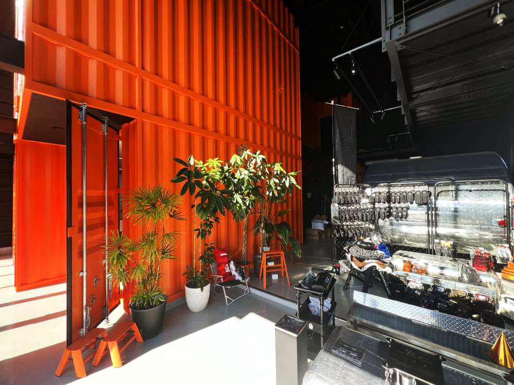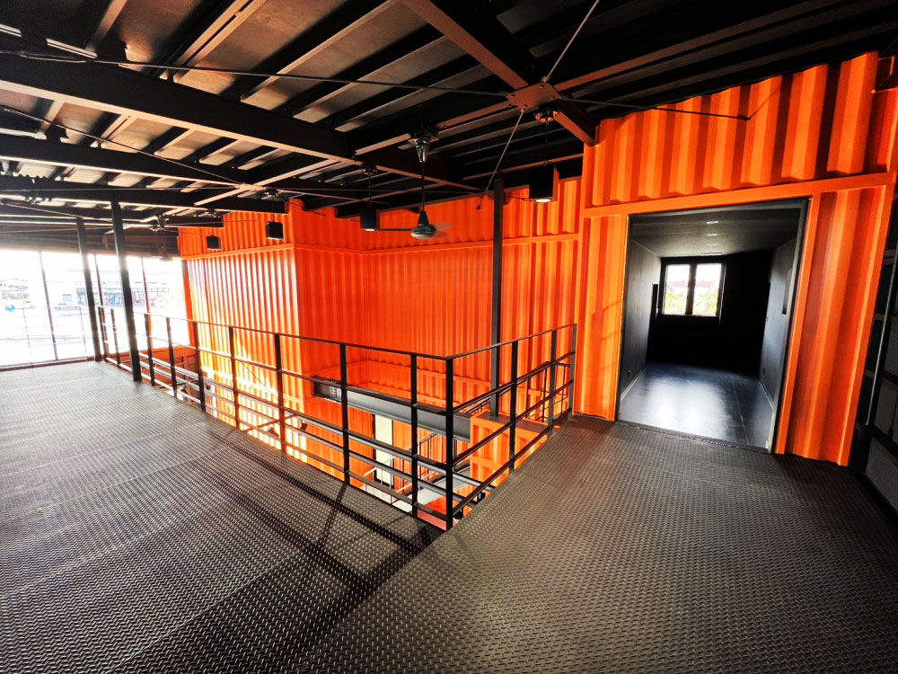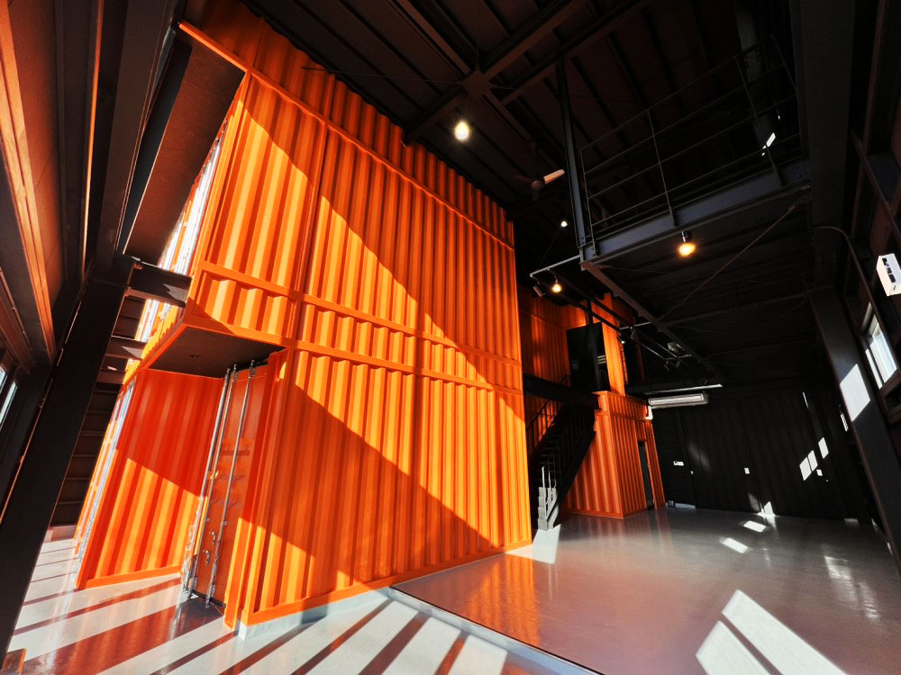 黒を基調とするスタイリッシュな建屋。その「内部」に鮮やかなオレンジのコンテナを配置するという、遊び心と機能美が融合した唯一無二の空間が完成しました。本プロジェクト最大の特長は、一般的な屋外設置ではなく、大空間の建屋の内部にコンテナをレイアウトしている点です。
