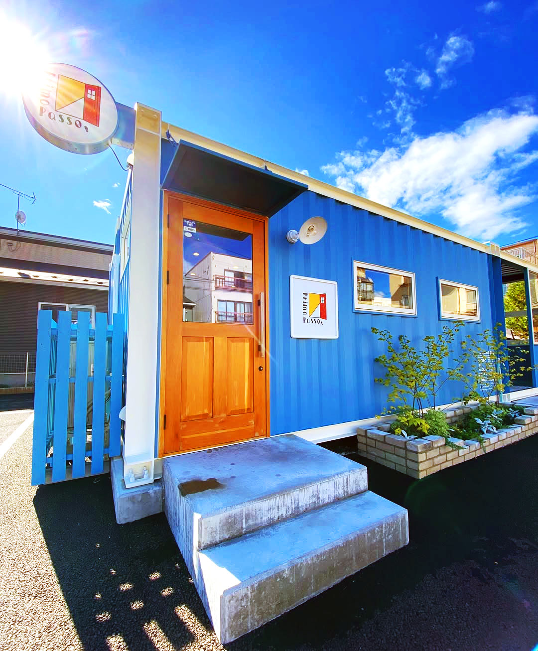 北海道岩見沢市毛陽町にあるコンテナカフェ。濃いブルーグレーのコンテナハウスと木製のドアが目印の店舗です。2台の40フィートハイキューブコンテナを使用しています。