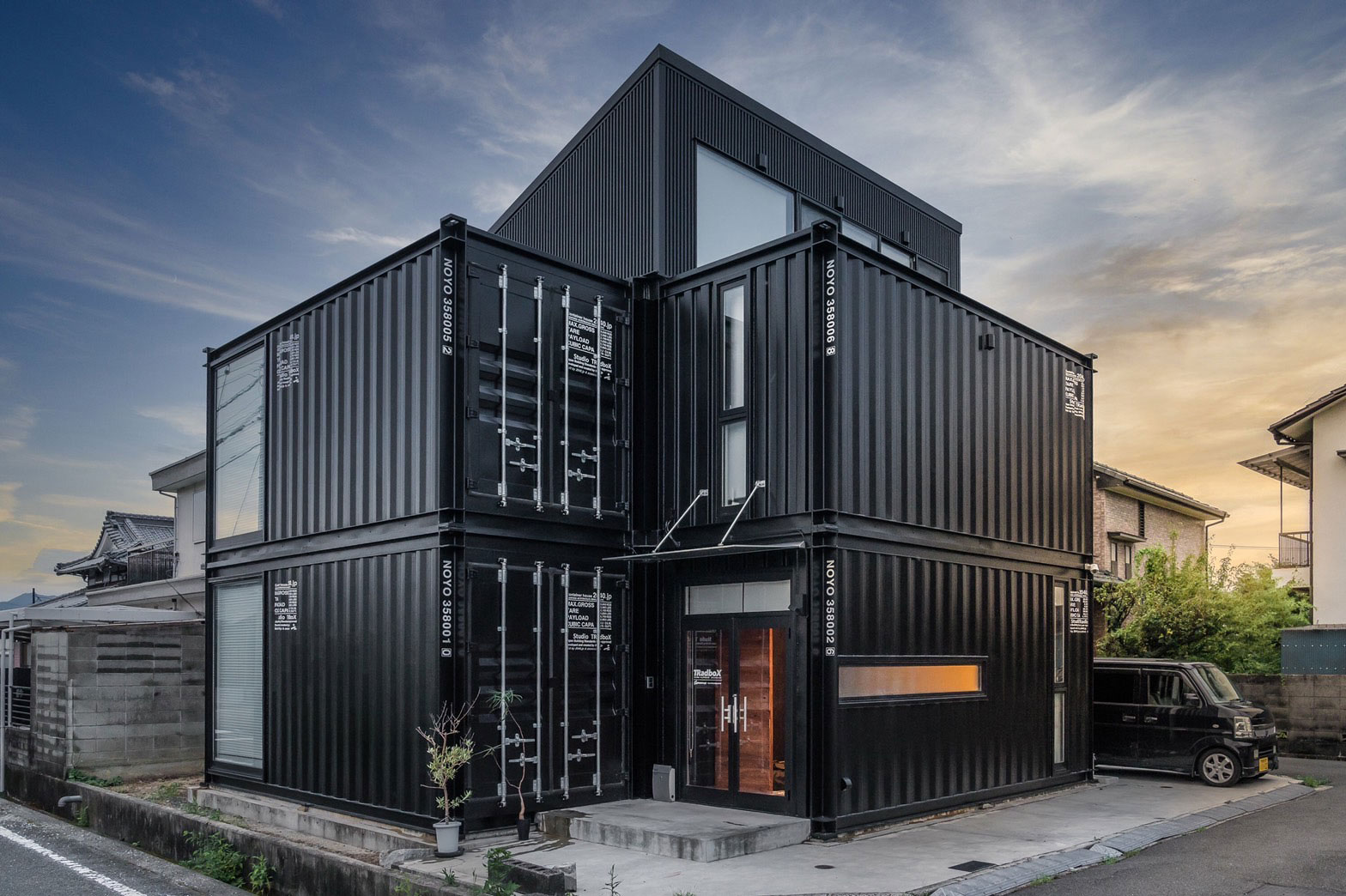 先ほどの事例ではコンテナの壁に開口部を設けて窓をはめ込んでいましたが、窓の代わりにパネルをはめ込んだり、コンテナの壁に外壁を重ねることで建物全体の雰囲気を変えることもできます。